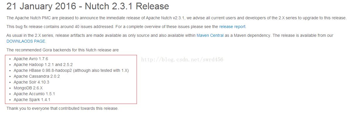 nutch 2.3.1建议使用的依赖组建版本:
