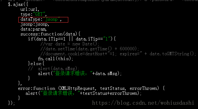 今天在项目使用跨域跳转时发送如下ajax请求,请求参数类型为jsonp格式(后面会讲jsonp格式与json的区别)。