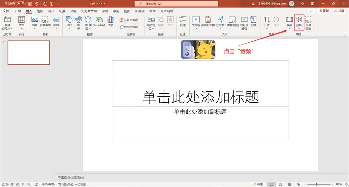 第2步:在【插入】里面的各个功能中找到并点击“音频”;