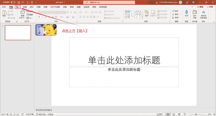 第1步:打开ppt后,在上方的菜单栏中点击【插入】;