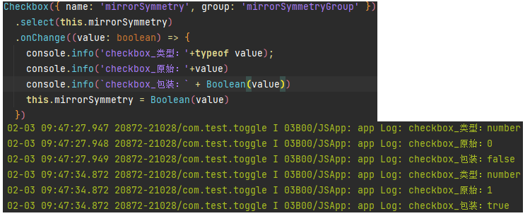 这个应该是ArkTS的底层编译机制,在实际打印时value不是布尔值,经过实际测试,打印出来的类型是number类型,所以是打印的数字0和1,如果外层使用包装类Boolen()包装一下,则打印出来的值就是正常的true or false了,如下图所示: