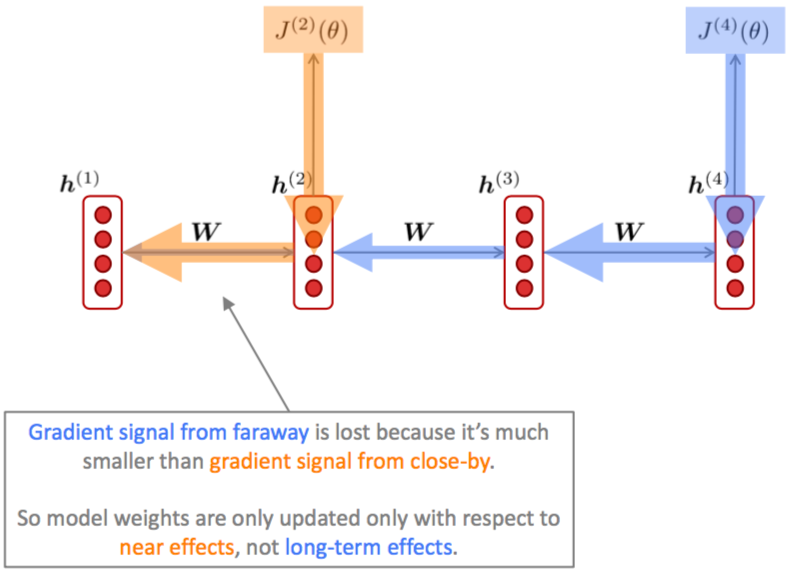 梯度消失会导致RNN不能捕获长期依赖关系,如下图(图片来自CS224n的ppt))