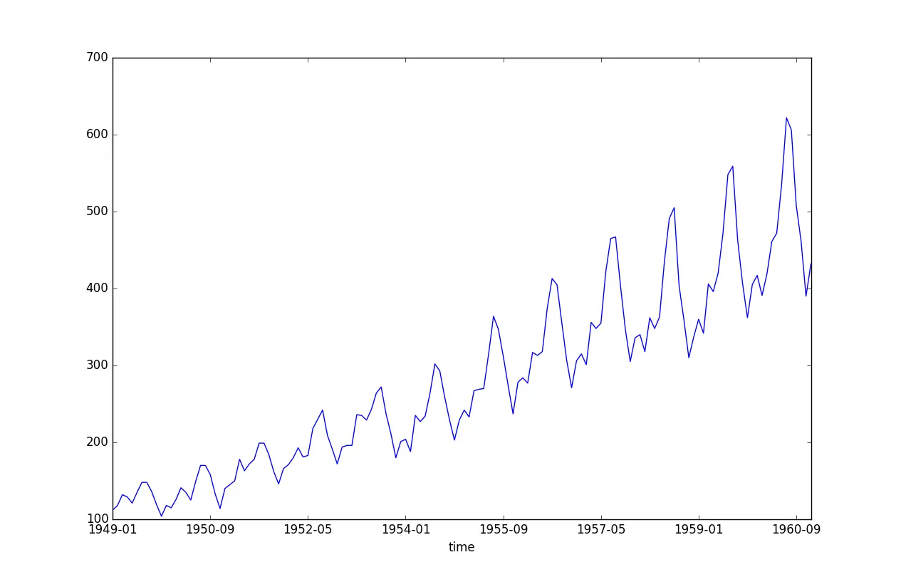 import matplotlib.pyplot as plt df = pd.read_csv('international-airline-passengers.csv', sep=',') df = df.set_index('time') df['passengers'].plot() plt.show()