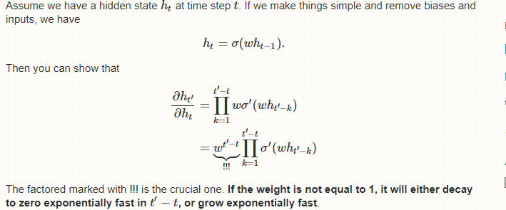 而rnn是过去时间序列的一个连乘;由参数w与tanh激活函数的导数值连乘而得到的;