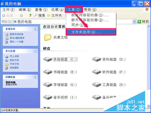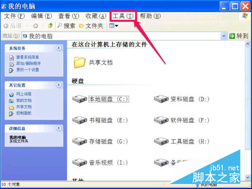 具体操作步骤,先从桌面“我的电脑”进入资源文件夹管理界面中,点击窗口上的“工具”菜单。