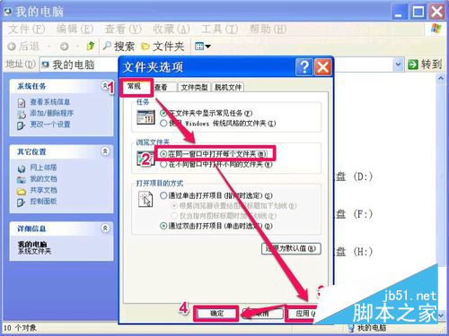 3.进入文件夹选项窗口后,在“常规”界面中,找到“浏览文件夹”项目,从其中选择“在同一窗口中打开每个文件夹”这一项,然后按“应用”保存,再按“确定”退出,设置就完成了,试一试,文件夹是不是在同一窗口中打开了。