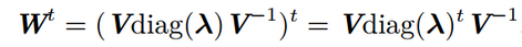而RNN还存在一个权值共享的问题,即这几个w都是一个,假设,存在一个反复与w相乘的路径,t步后,得到向量: