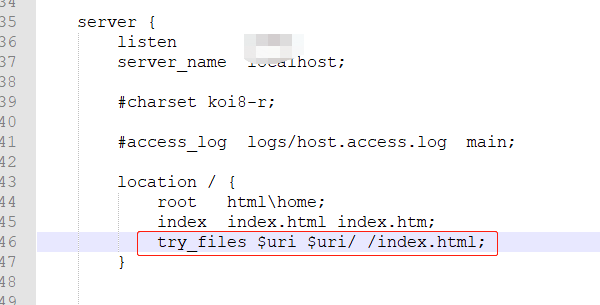 问题描述:部署好项目后用地址+端口直接打开项目,加载首页后地址http://127.0.0.1:1888/home,当页面刷新的时候报错404,感觉是vue路由没有生效。本人新手,就找了找网上的办法,修改nginx配置文件问题解决,如下: