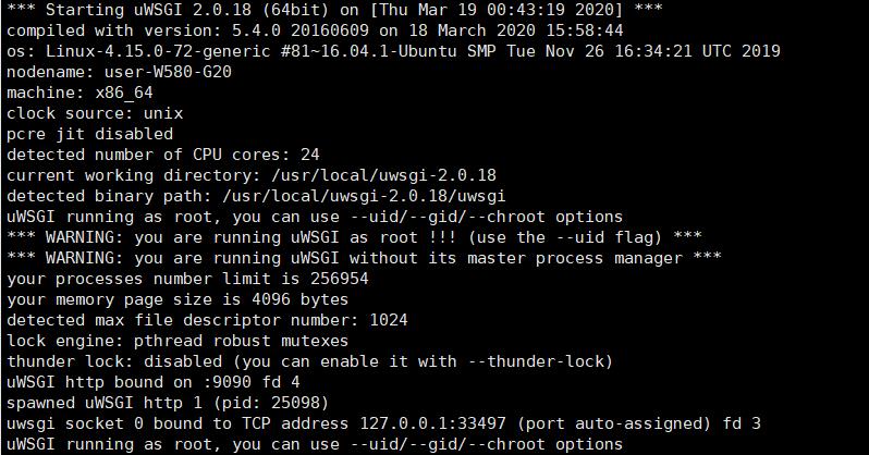 接下来我们启动 uWSGI 来运行一个 HTTP 服务器,将程序部署在HTTP端口 9090 上(使用 user用户启动uwsgi):