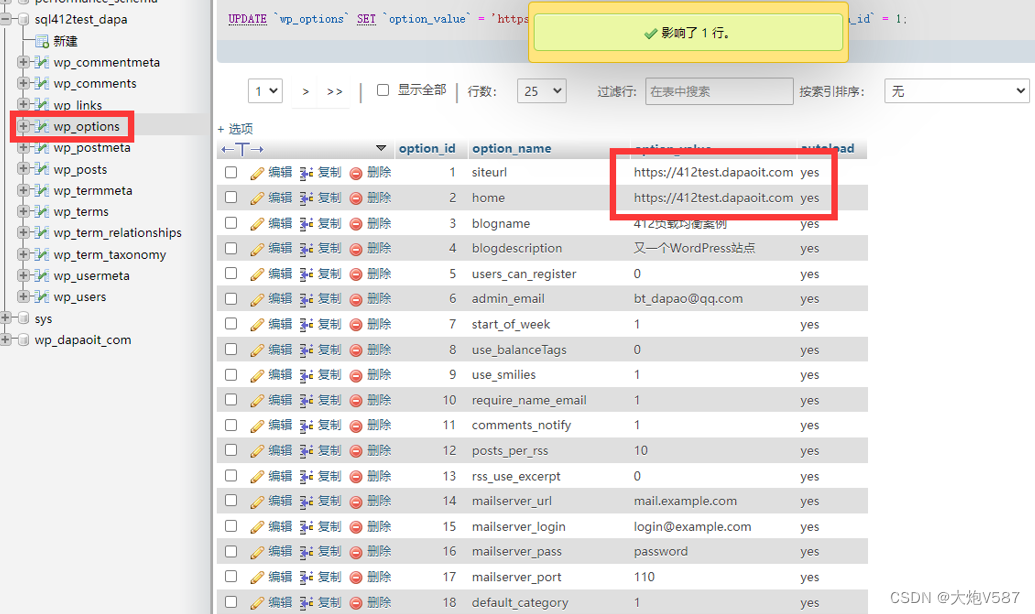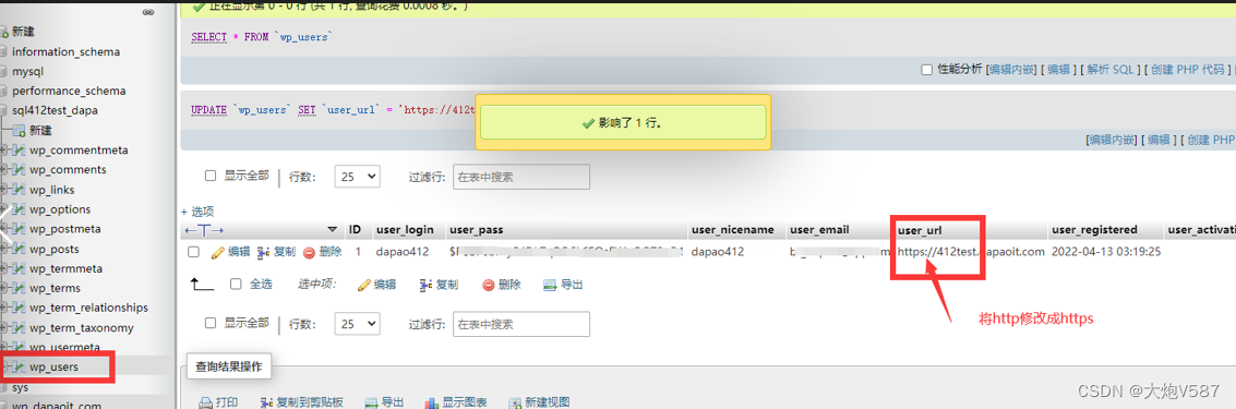 14、使用phpmyadmin打开WordPress的数据库,将 wp_options、wp_users表中的http连接全部修改成https的