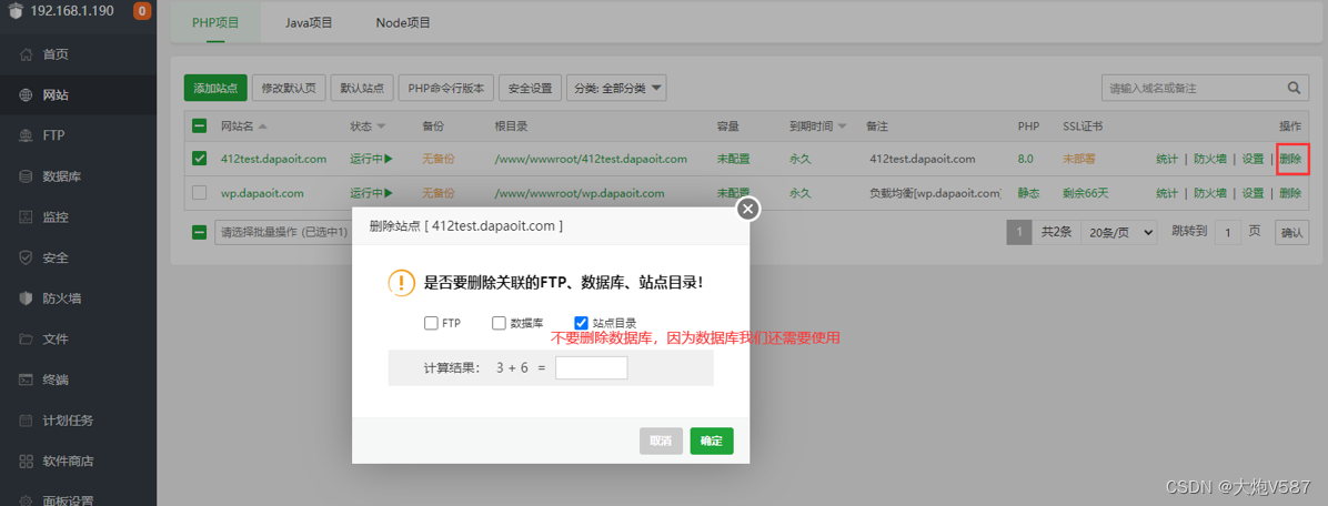 6、回到主节点,删除当前的建站环境,注意不要删除数据库