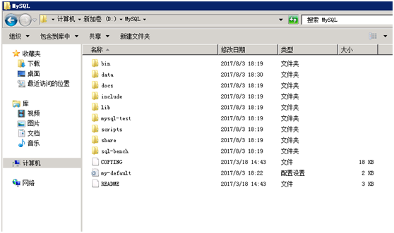 2 在D盘创建目录,比如D:\MySQL,将mysql-5.6.36-winx64.zip解压缩到该目录下,如下图所示: