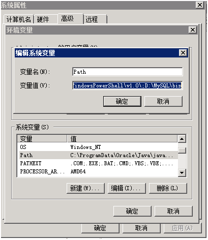 3 修改系统Path变量,增加D:\MySQL\bin,如下图所示: