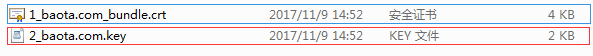 Nginx环境配置证书方法(证书目录只有两个文件的): 进入nginx(证书)目录,有以下两个文件 其中红框.key后缀的是服务器私钥,填入面板证书的左边红框中(用文本编辑器完整复制粘贴进去) 蓝框.crt后缀的是证书(也可能是pem后缀),填入面板证书的右边蓝色框中(用文本编辑器完整复制粘贴进去)