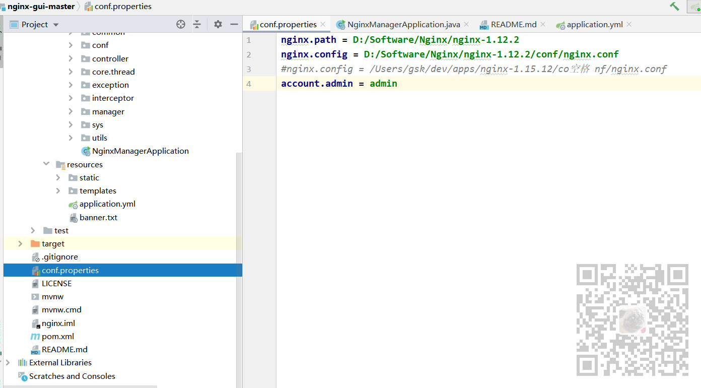 将nginx.path修改为自己的nginx的目录,将nginx.config修改为为自己的配置文件的目录。这里是nginx在Windows上的路径.