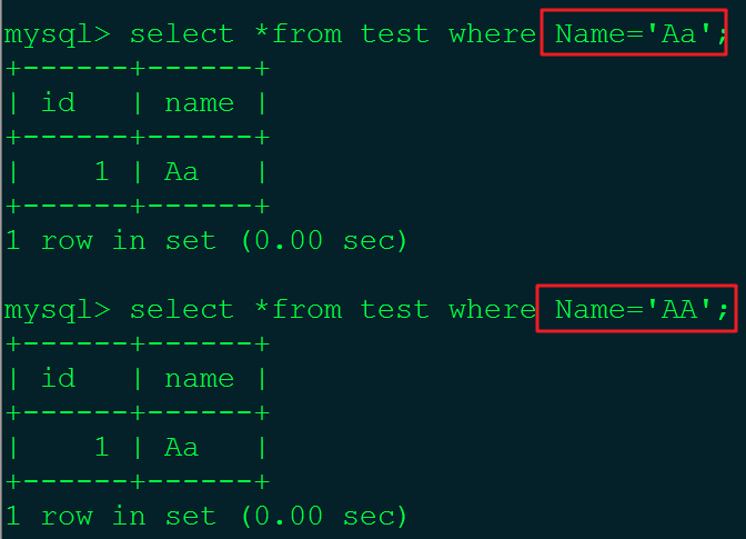 分析:利用‘Aa’和‘aa’查询出相同的结果,说明查询时对字段内容进行了转换(大写转换成小写),造成了这一现象。