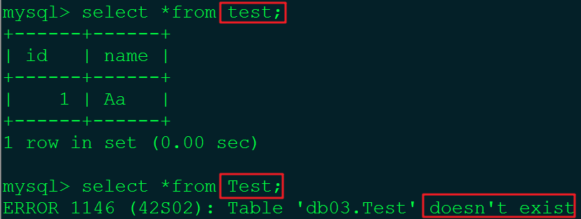 分析:对比两组查询,可以知linux下,mysql默认对表名大小写敏感。