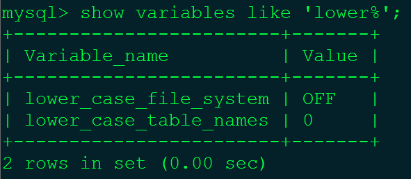 lower_case_file_system:OFF表示大小写敏感,ON表示大小写不敏感。lower_case_table_names:0表示敏感,1表示不敏感。