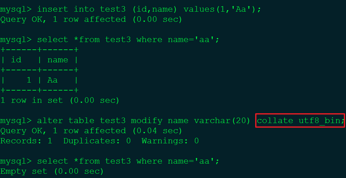 alter table test3 modify name varchar(20) collate utf8_bin;