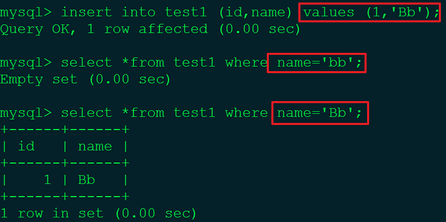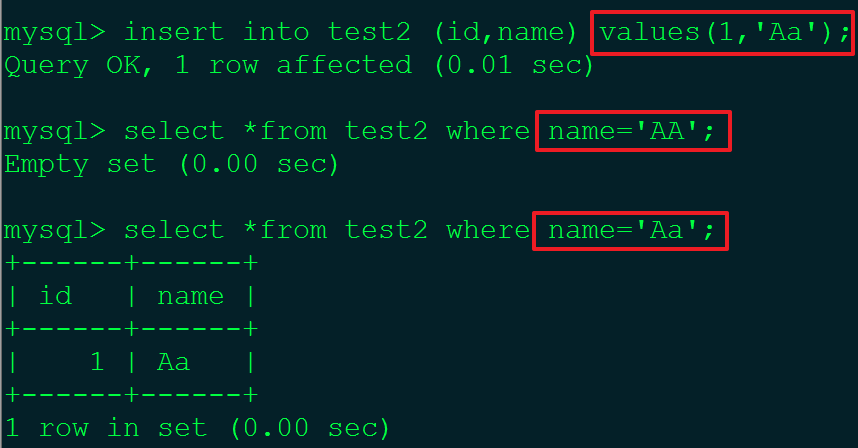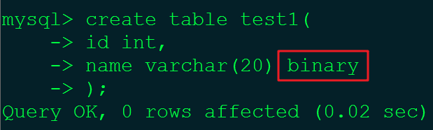 ② 在查询条件的字段前加binary,但是不建议这么做,因为会使字段索引失效。