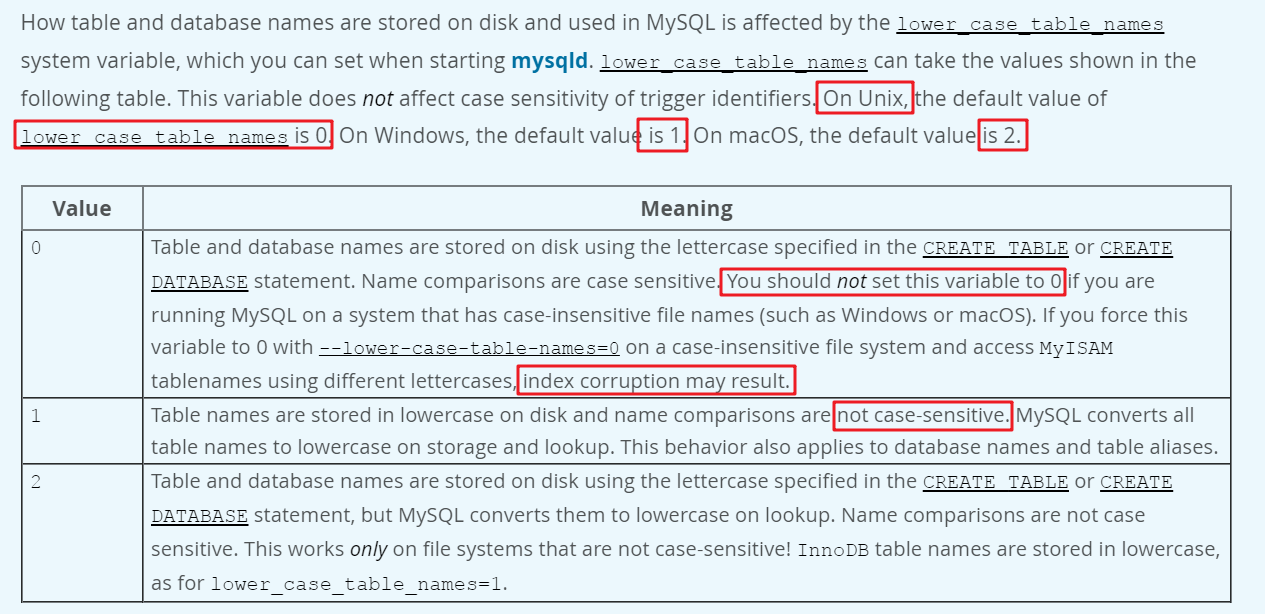 ② Unix下默认为0,也就是大小写敏感的;Windows下默认为1,不敏感;macOS默认为2,存储区分大小写,但是在查询时会转换为小写。