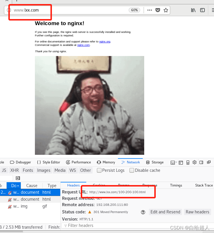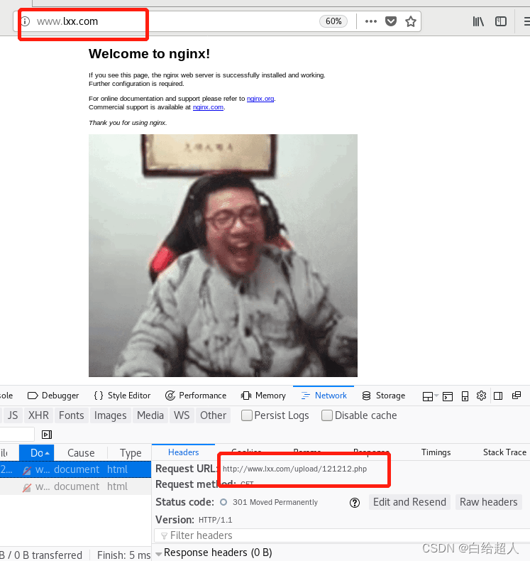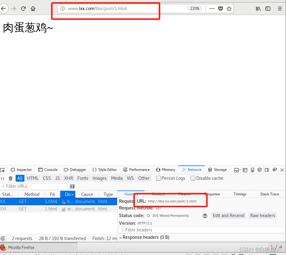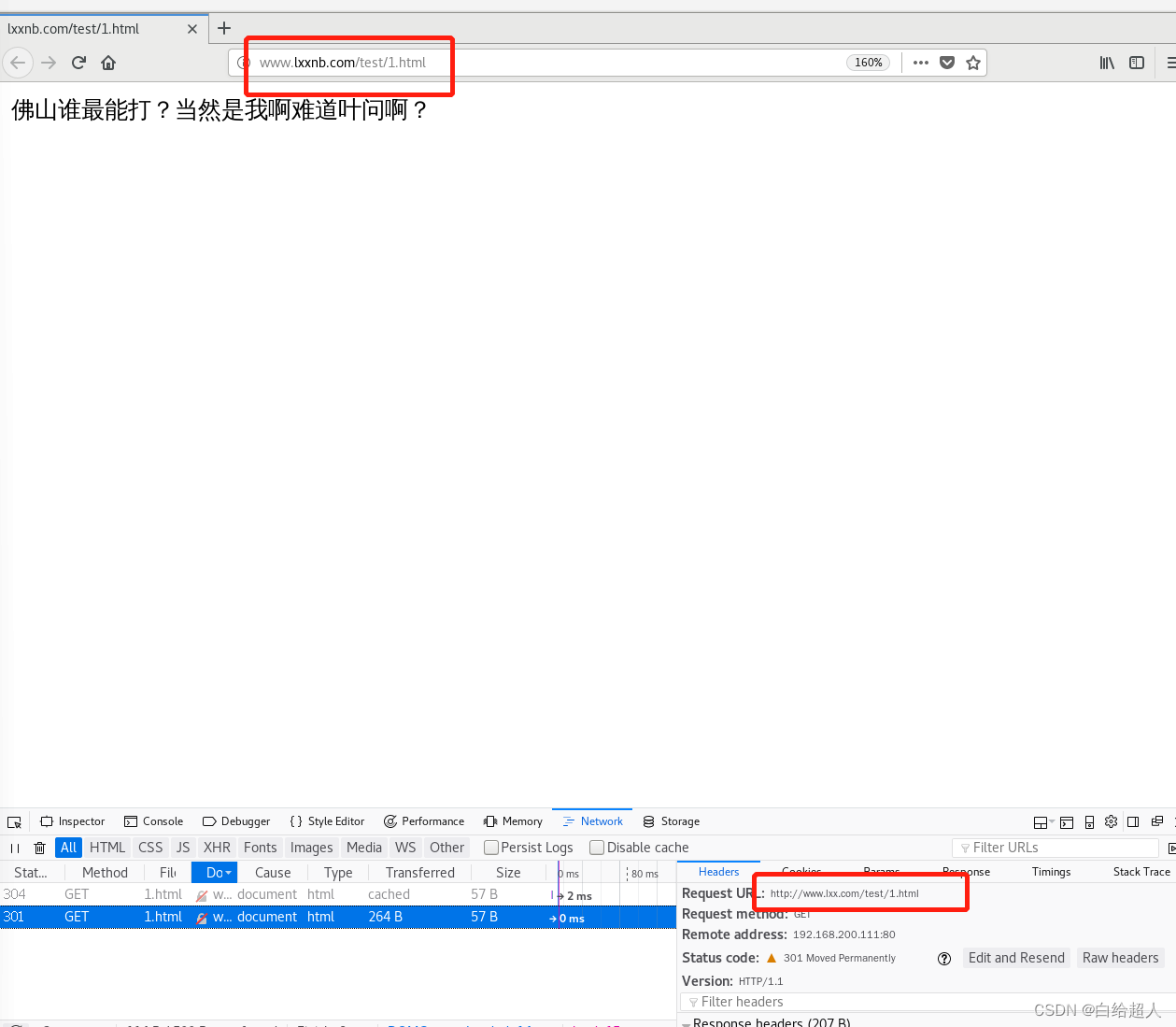 会跳转到www.lxxnb.com/test/1.html,查看元素可以看到返回301,实现了永久重定向跳转,而8且域名后的参数也正常跳转。