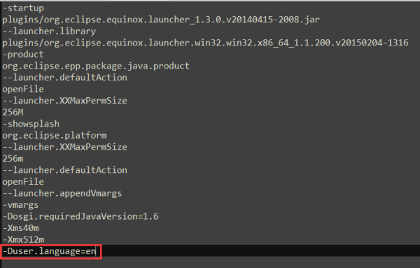 2、在末尾加入 -Duser.language=en重启eclipse就能看到是英文版的了