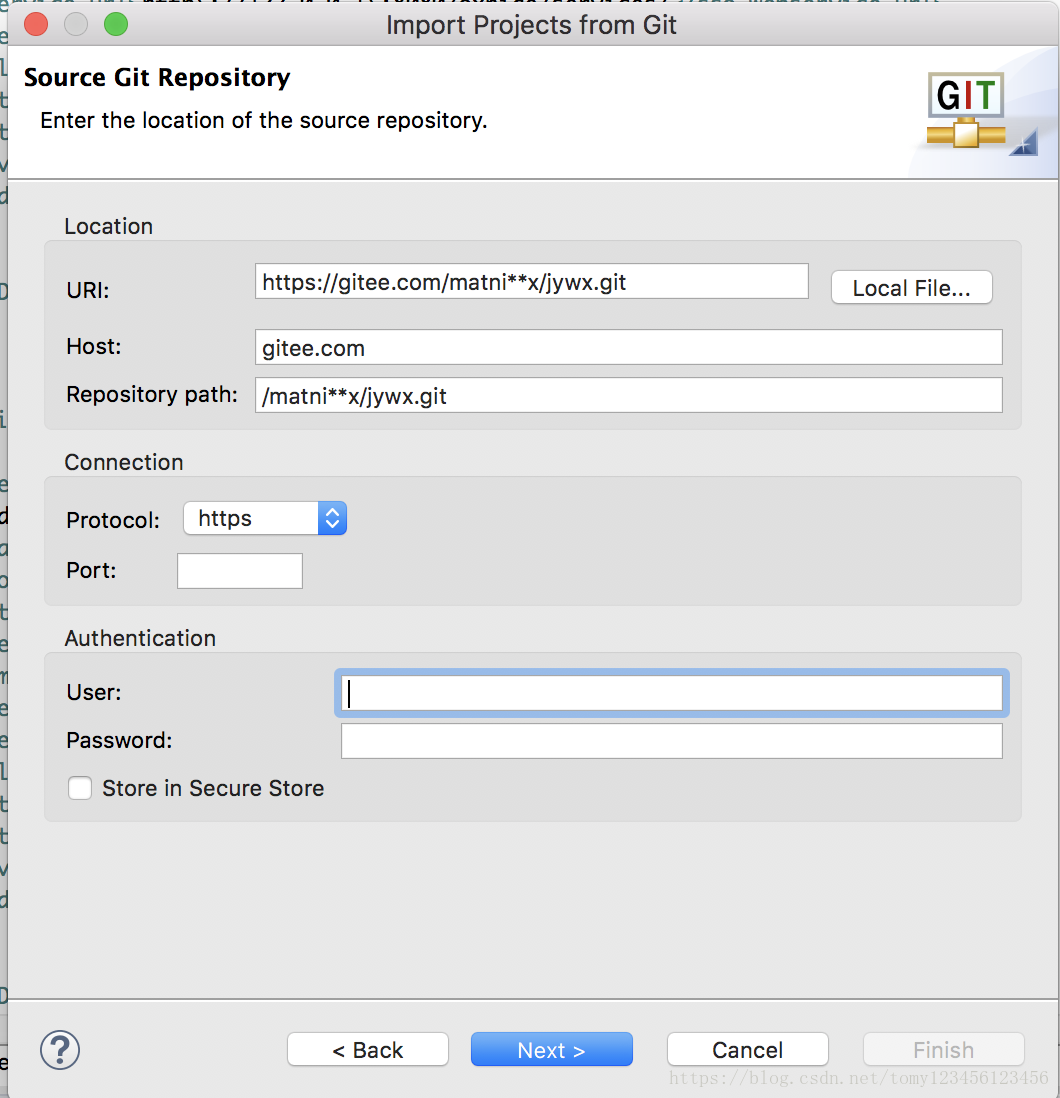 - 选择next,粘贴如下信息,克隆的地址URL(注意填上您在github或者gitee上申请的账号密码)