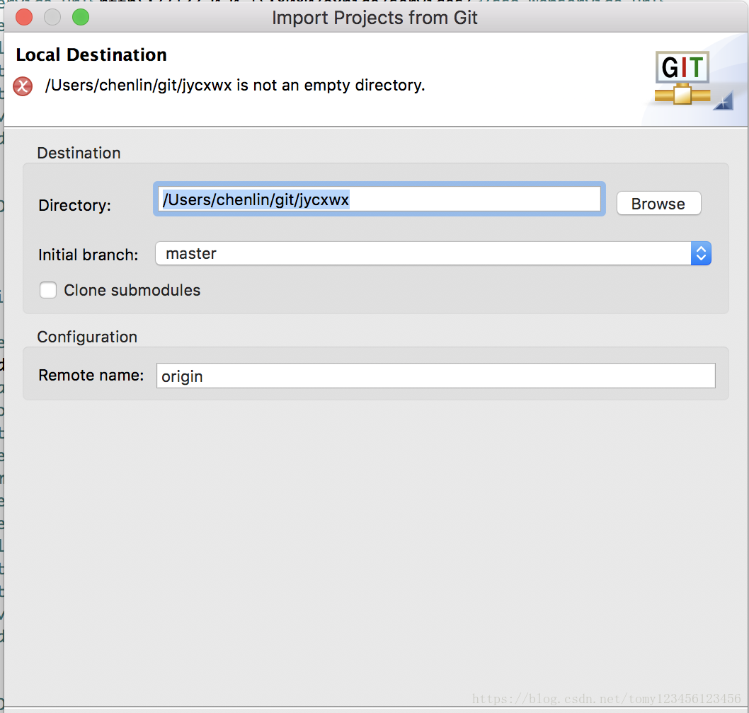 解决办法:先后退一步;然后进入c:/你的userName/git下载的项目文件夹中,把原项目的.project文件删除,然后再点击Finish。