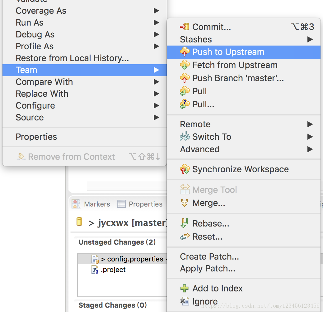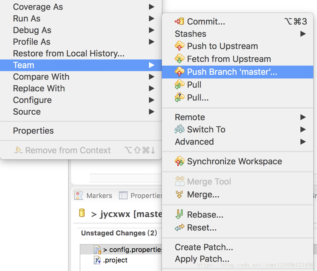 即:把你在eclipse-workspace的项目,提交到/Users/******/git/jyc**x项目中去。