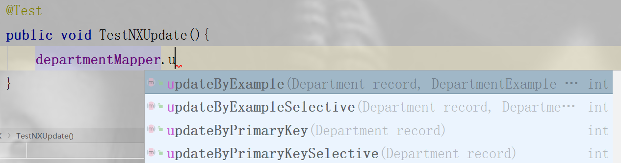 public class TestNX { private ClassPathXmlApplicationContext ac; private UserMapper userMapper; private DepartmentMapper departmentMapper; @Before public void doBefore(){ ac=new ClassPathXmlApplicationContext("spring-config.xml"); userMapper=ac.getBean("userMapper",UserMapper.class); departmentMapper=ac.getBean("departmentMapper",DepartmentMapper.class); } @Test public void TestNXSelect(){ //创建用于设置条件的对象 DepartmentExample de=new DepartmentExample(); DepartmentExample.Criteria criteria=de.createCriteria(); criteria.andIdBetween(2,3); //查询方法一:根据条件查询 List<Department> list=departmentMapper.selectByExample(de); System.out.println(list); //查询方法二:根据主键查询 Department department=departmentMapper.selectByPrimaryKey(1); System.out.println(department); } @After public void doAfter(){ ac.close(); } } -