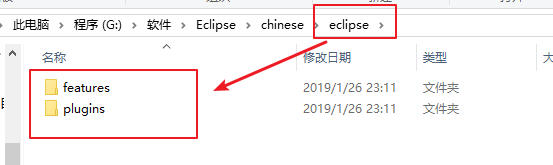 7.找到你的eclipse安装路径,里面会有两个和上图中名字一样的文件夹,复制汉化包里面的这两个到源路径上,选择不同的替换。