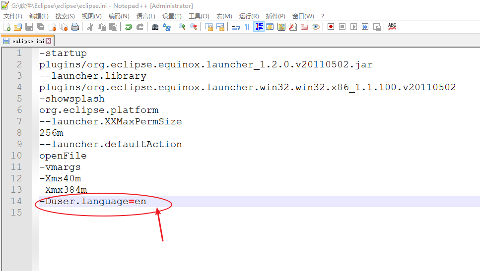4.如何你想换回英文,还在刚才那个.ini文件的最后一行,改成-Duser.language=en即可