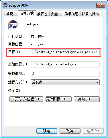 在Eclipse的快捷方式上右键点击,下拉菜单中选择“属性”,操作截图显示如下: