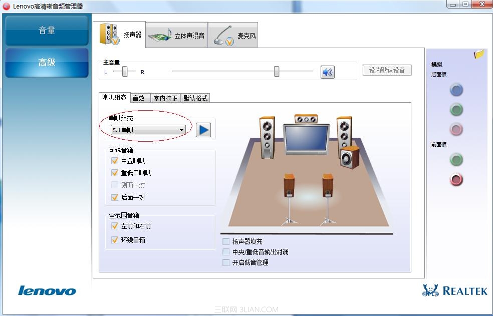 1)“lenovo高清晰音频管理器-高级-扬声器-喇叭组态”;