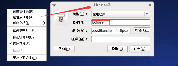 解压后即可使用。在 CentOS 中可以为程序创建桌面快捷方式,如下图所示,点击桌面右键,选择创建启动器,填写名称和程序位置(/usr/lib/eclipse/eclipse):