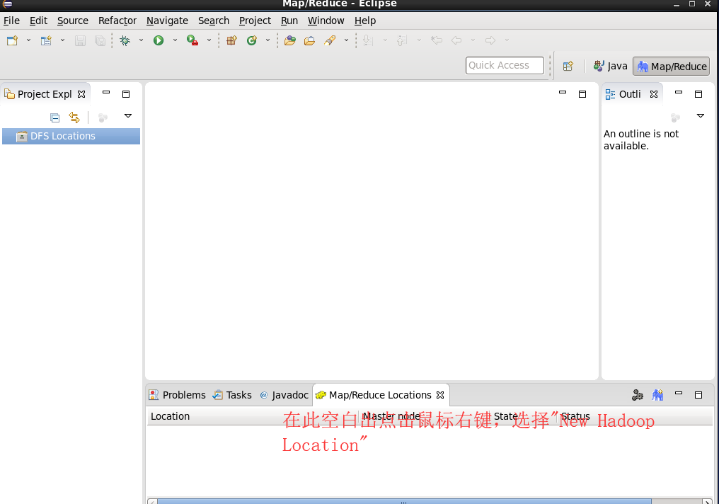 第三步:建立与 Hadoop 集群的连接,点击 Eclipse软件右下角的 Map/Reduce Locations 面板,在面板中单击右键,选择 New Hadoop Location。