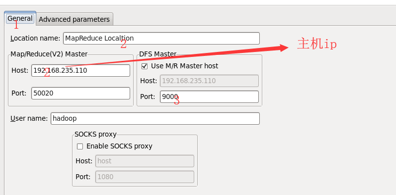 在弹出来的 General 选项面板中,General 的设置要与 Hadoop 的配置一致。一般两个 Host 值是一样的,如果是伪分布式,填写 localhost 即可,另外我使用的Hadoop伪分布式配置,设置 fs.defaultFS 为 hdfs://192.168.265.110:9000,则 DFS Master 的 Port 要改为 9000。Map/Reduce(V2) Master 的 Port 用默认的即可,Location Name 随意填写。