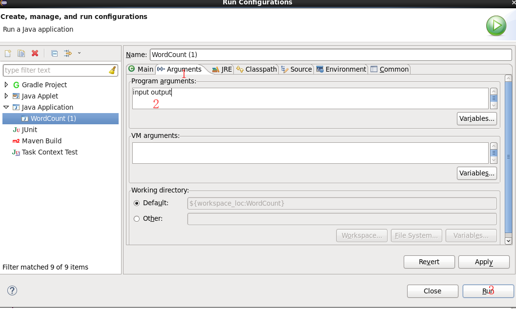右键点击刚创建的 WordCount.java,选择 Run As -> Run Configurations,在此处可以设置运行时的相关参数(如果 Java Application 下面没有 WordCount,那么需要先双击 Java Application)。切换到 “Arguments” 栏,在 Program arguments 处填写 “input output” 就可以了。