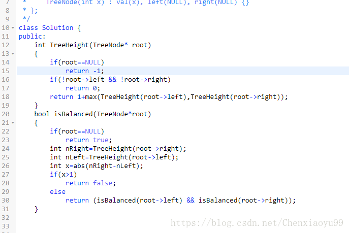 在这道题中,我整整是做了一天的时间来完成它,首先我先了解了什么事平衡二叉树,复习了一遍二叉树的相关知识,也算是巩固吧,这道题中我用了整整两边递归,一个递归是求树的高度,一个是判断树是否为平衡二叉树,在这个题中为了更好的了解递归,可以把递归看做成一个黑盒子,不必细了解其内部的调用,当然如果好奇可以跟我一样,把调用的过程一步一步写出来,这样理解的会更加透彻。下面是我的代码