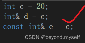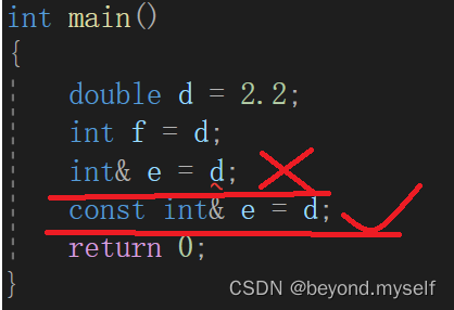 再看引用:int& e=d; 临时变量具有常性,所以这里把临时变量给引用e的时候,相当于是把自带const的临时变量赋值给非const的e,把只读的给可读可写的是放大了权限,所以错误;必须改成const int& e=d; 才正确!