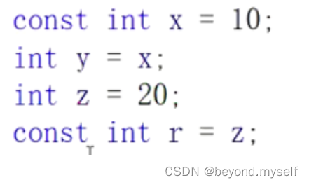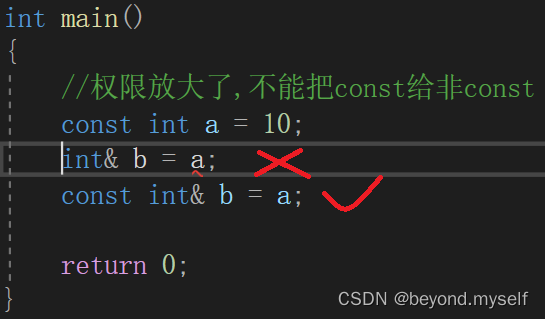 对原引用变量,权限只能缩小,即 可读可写(普通类型) 可以改成 只读(const);不能放大:,即 只读 不能改成 可读可写的