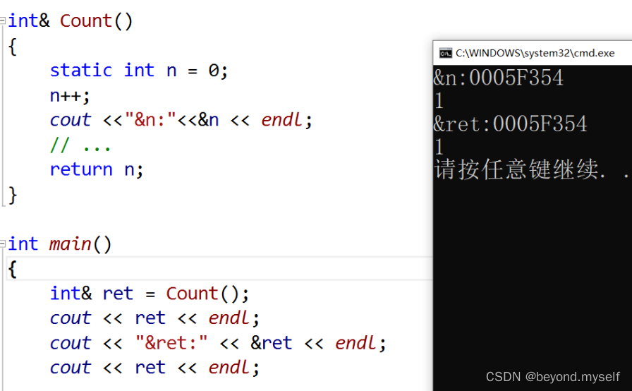 当用引用接收引用返回时:这里ret和n的地址一样,也就意味着ret其实就是n的别名。但是因为n出作用域不会立即被覆盖,所以第一次通过ret可以打印是1,当打印第二次时,因为前面已经调用过一次打印函数,已 "销毁" 的Count函数栈帧在此时被打印函数覆盖,再打印ret就会是随机数了!