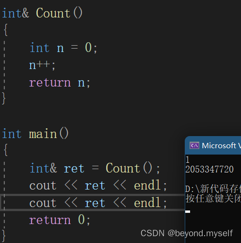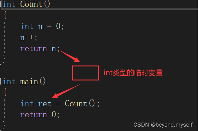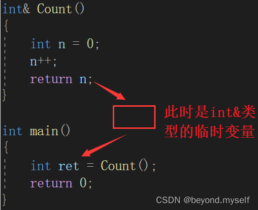 如何证明返回时存在临时变量呢?:如果你用int& ret 接收,写成int& ret = Count(); 发现无法运行,因为临时变量有常性,所以需要写成const int& ret = Count(); 才能通过。
