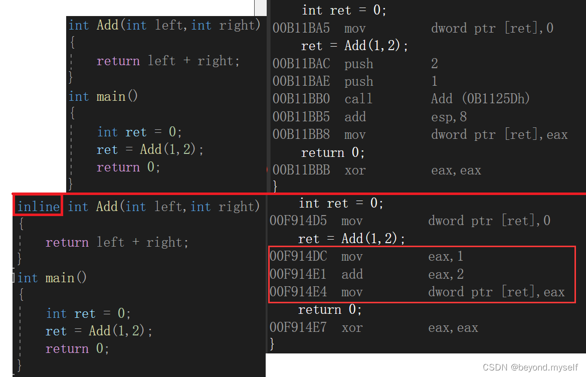 在函数定义前加个 " inline ",就会在调用此函数的时候展开这个函数,通过汇编指令我们能清晰看到原本调用此函数的地方应是call Add,加上inline后他就会直接把Add函数的指令放到ret = Add(1, 2); 的位置了,即:如果在函数前增加inline关键字将其改成内联函数,在编译期间编译器会用函数体替换函数的调用。