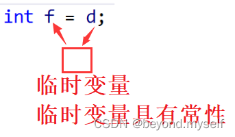 解释:隐式类型转换的普通赋值的情况,上面的例子:int f=d;从语法上看把8字节的d不能直接给4字节的f,因为浮点数和整形的存储形式就不一样,没办法直接截取,所以d需要先把整数部分给一个4字节的临时变量,再把临时变量给f