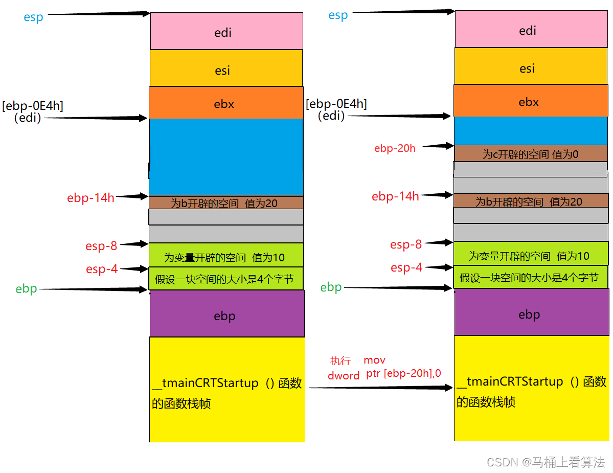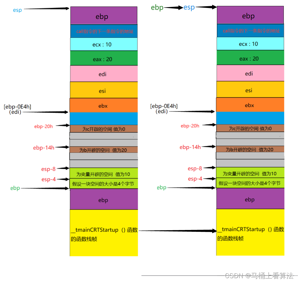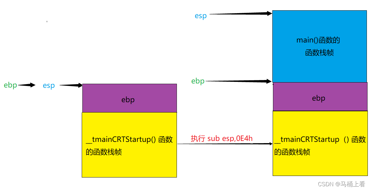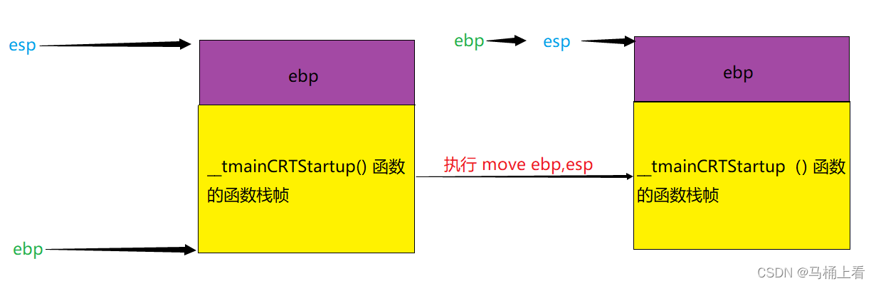 将 ebp 的值放到 __tmainCRTStartup() 函数的函数栈帧的上面 (ebp 的值为该函数栈帧的栈底指针)