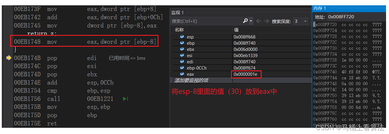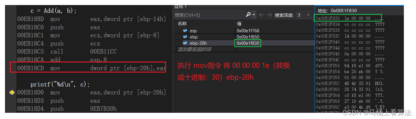 ebp+0Ch 存放的是变量b传参(形参 y)的值,eax 中的值是10,就是将 20 + 10 的结果存放到 eax 中。