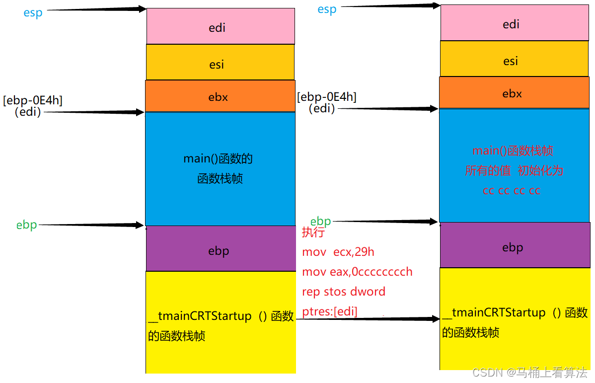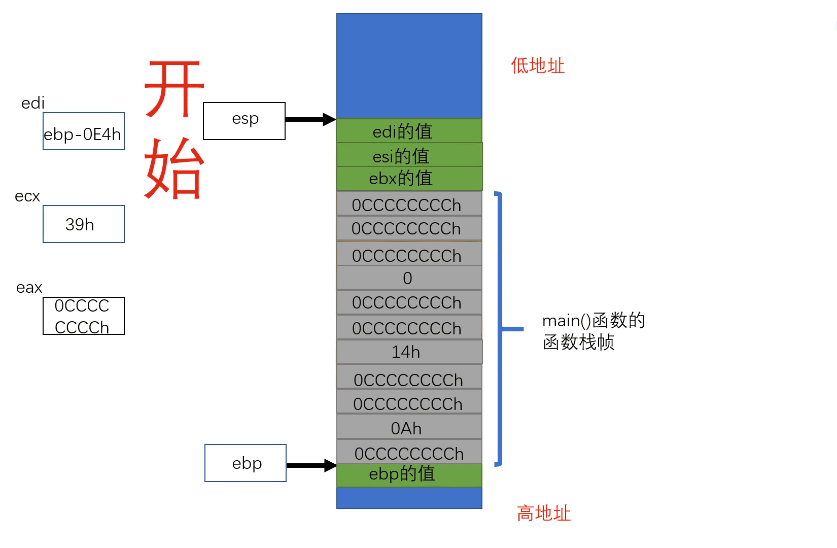 rep stos dword ptr es:[edi]:从edi ( 此时 edi 中存放的是main函数栈帧栈顶处的值 ) 开始向下将39h这么大的空间中的值全部初始化为0CCCCCCCCh(eax)。