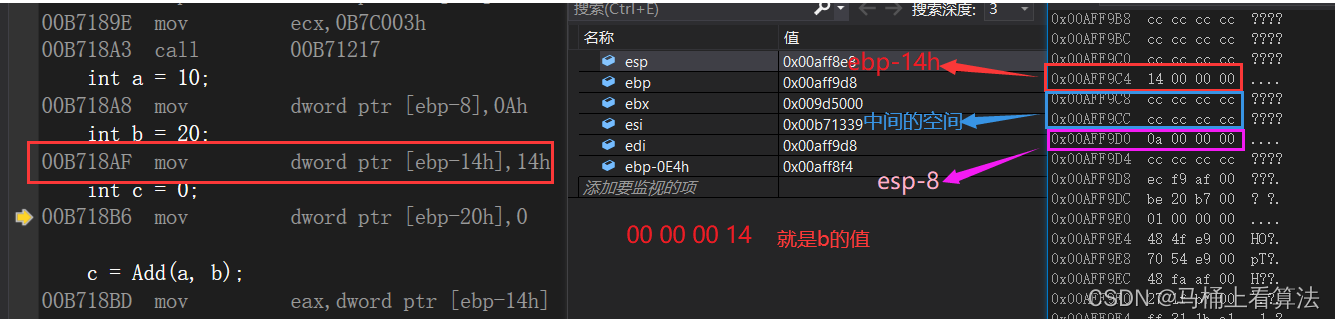 此时ebp 的值为 0x012FFAA0 所以 ebp - 14h 的值为 0x012FFA8C,可以发现编译器为变量 b 开辟的空间距离变量 a 是跳过8个字节。